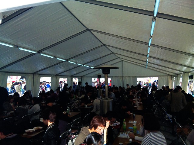 場内に点在する仮設食堂はどこも人でごった返していて、